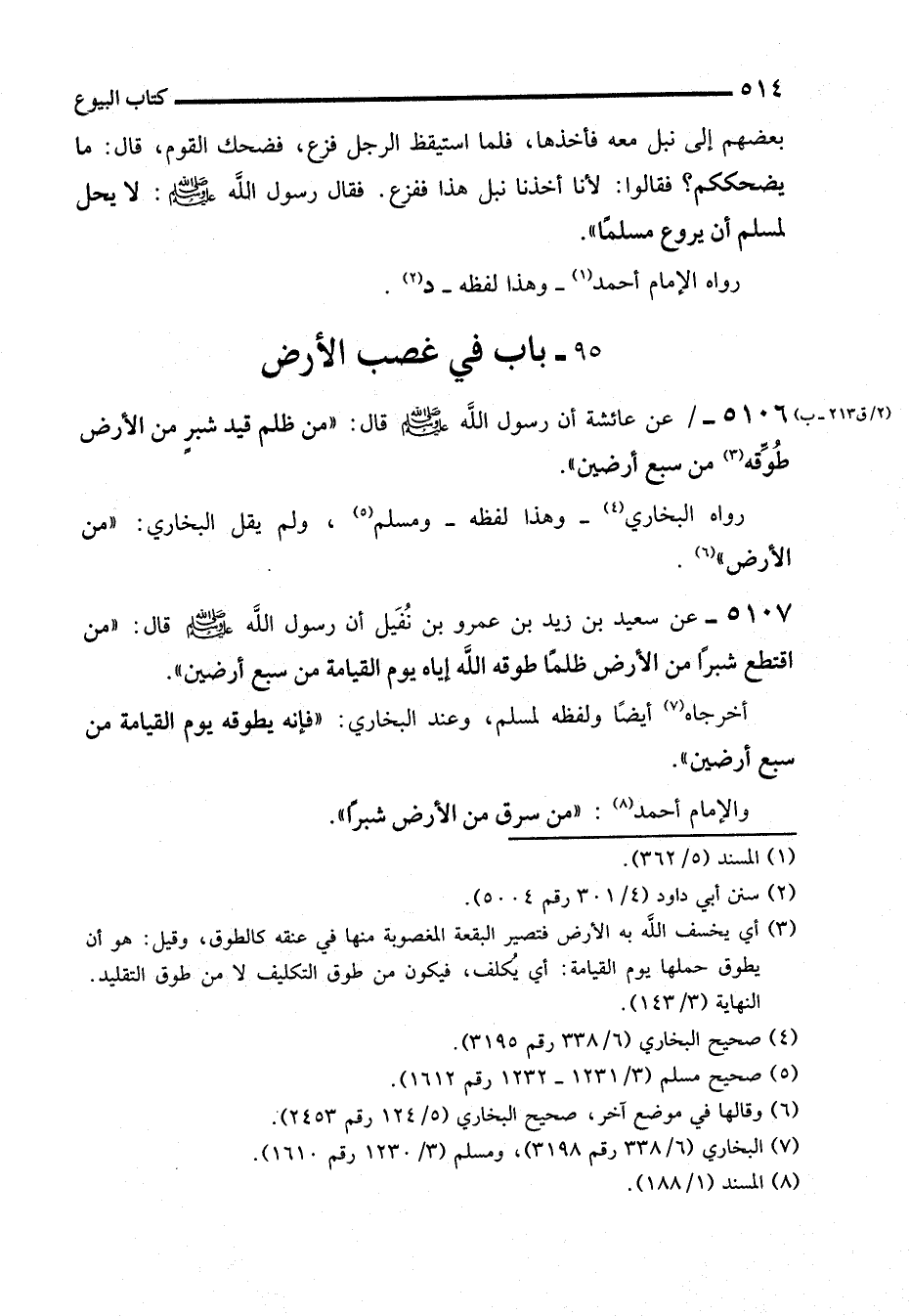 5106 - عن عائشة أن رسول الله - صلى الله عليه وسلم - قال: "من ظلم قيد شبرٍ من الأرض طُوِّقه (¬3) من سبع أرضين".