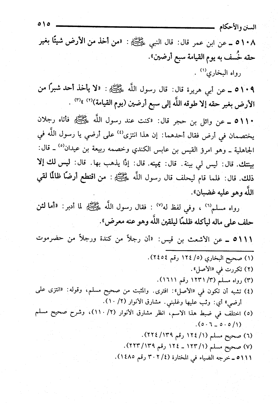 5109 - عن أبي هريرة قال: قال رسول الله - صلى الله عليه وسلم -: "لا يأخذ أحد شبرًا من الأرض بغير حقه إلا طوقه الله إلى سبع أرضين (يوم القيامة) (¬2) " (¬3).