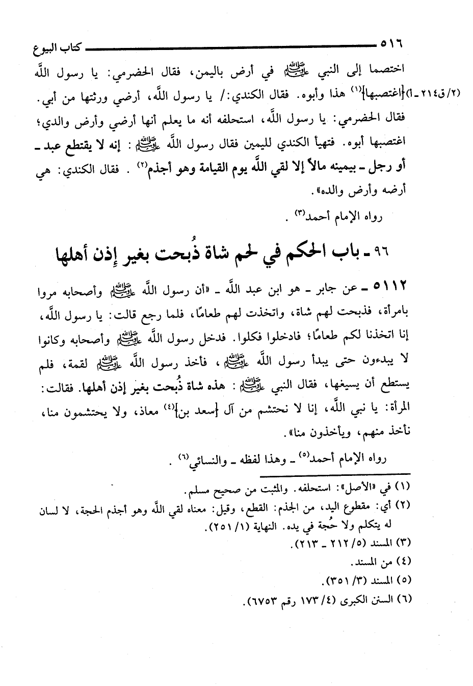 5112 - عن جابر -هو ابن عبد الله- "أن رسول الله - صلى الله عليه وسلم - وأصحابه مروا بامرأة، فذبحت لهم شاة، واتخذت لهم طعامًا، فلما رجع قالت: يا رسول الله، إنا اتخذنا لكم طعامًا؛ فادخلوا فكلوا. فدخل رسول الله - صلى الله عليه وسلم - وأصحابه وكانوا لا يبدءون حتى يبدأ رسول الله - صلى الله عليه وسلم -، فأخذ رسول الله - صلى الله عليه وسلم - لقمة، فلم يستطع أن يسيغها، فقال النبي - صلى الله عليه وسلم -: هذه شاة ذُبحت بغير إذن أهلها. فقالت: المرأة: يا نبي الله، إنا لا نحتشم من آل (سعد بن) (¬4) معاذ، ولا يحتشمون منا، نأخذ منهم، ويأخذون منا".