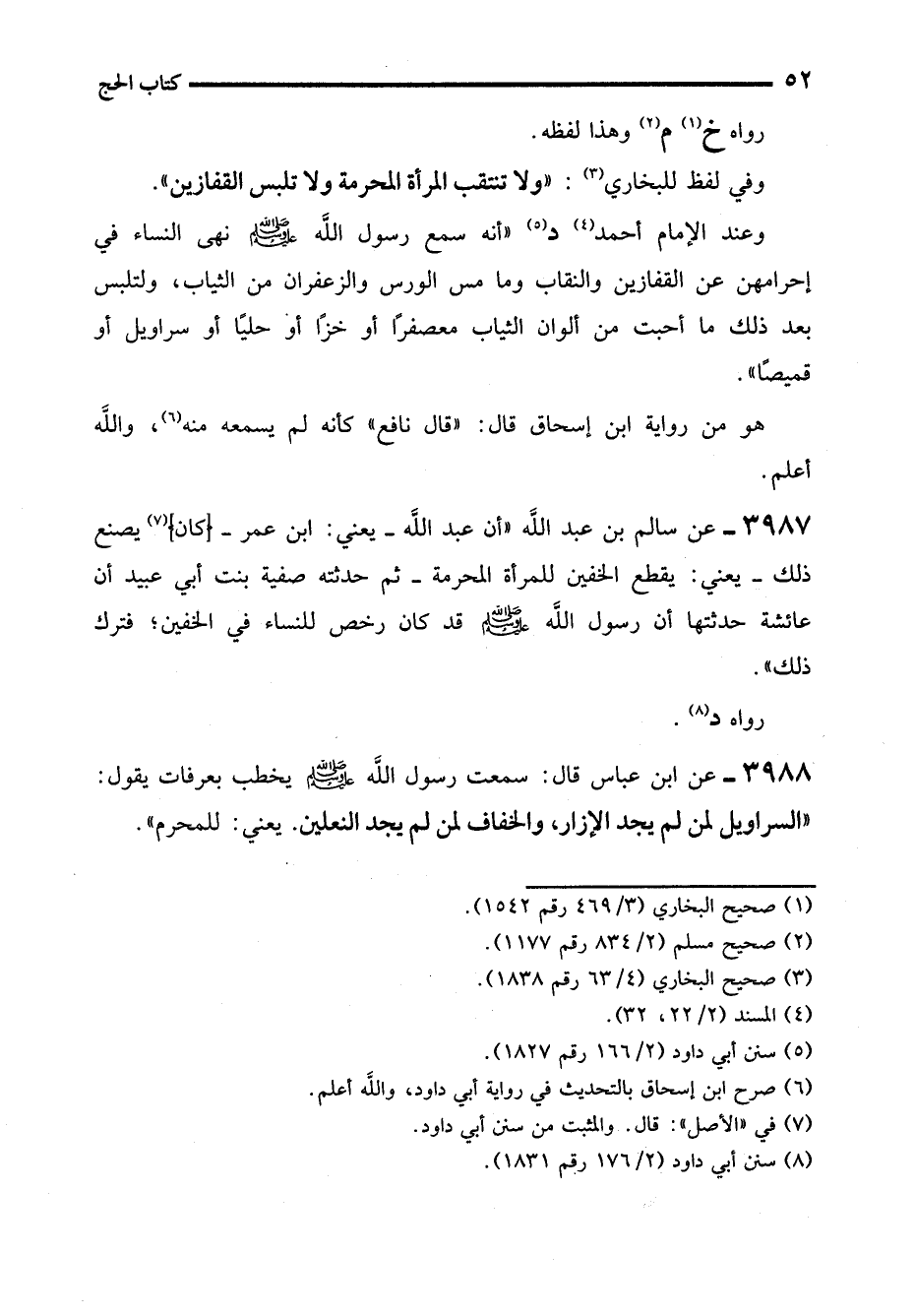 3987 - عن سالم بن عبد الله "أن عبد الله -يعني: ابن عمر- (كان) (¬7) يصنع ذلك -يعني: يقطع الخفين للمرأة المحرمة- ثم حدثته صفية بنت أبي عبيد أن عائشة حدثتها أن رسول الله - صلى الله عليه وسلم - قد كان رخص للنساء في الخفين؛ فترك ذلك".