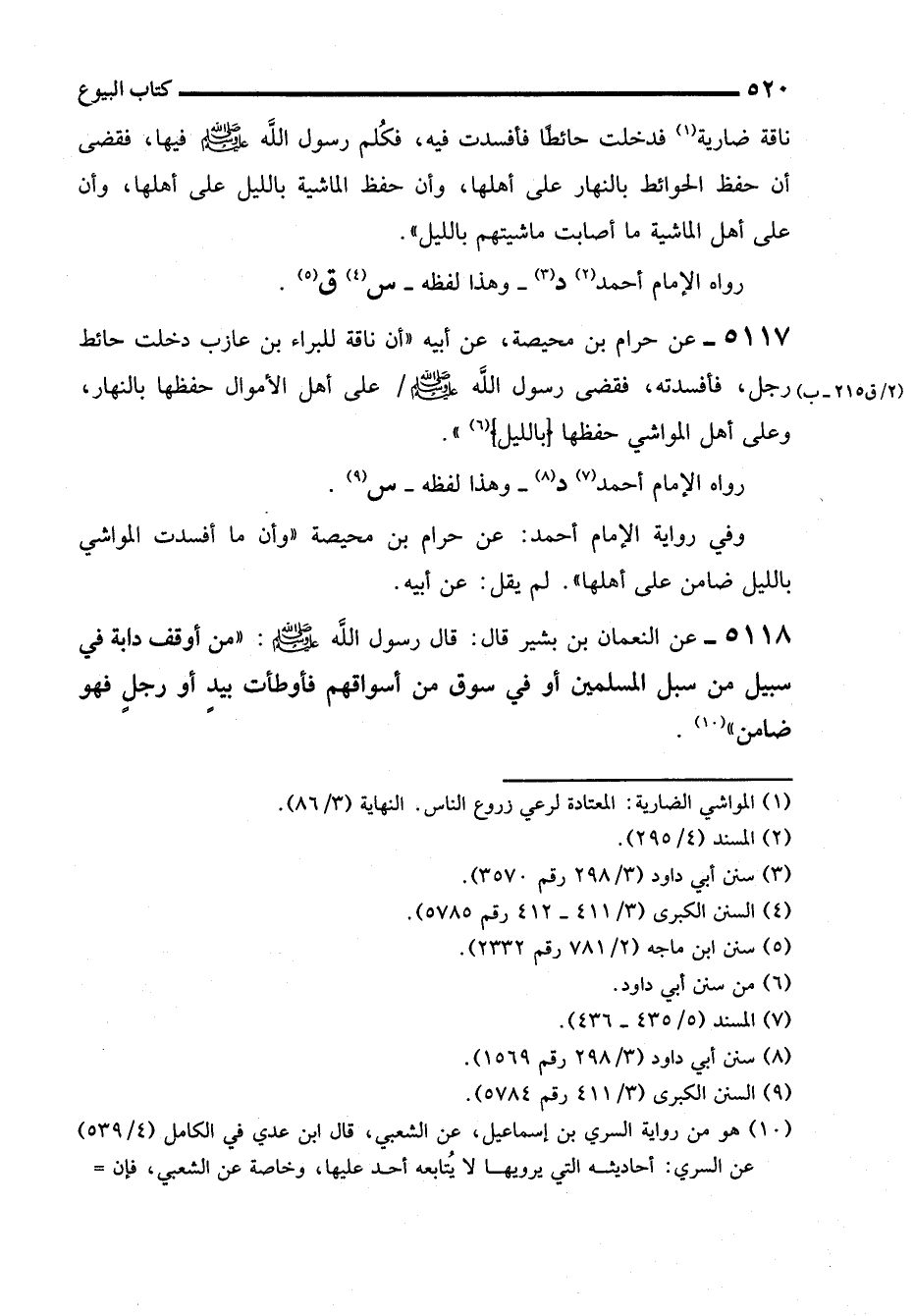 5118 - عن النعمان بن بشير قال: قال رسول الله - صلى الله عليه وسلم -: "من أوقف دابة في سبيل من سبل المسلمين أو في سوق من أسواقهم فأوطأت بيدٍ أو رجلٍ فهو ضامن" (¬10).
