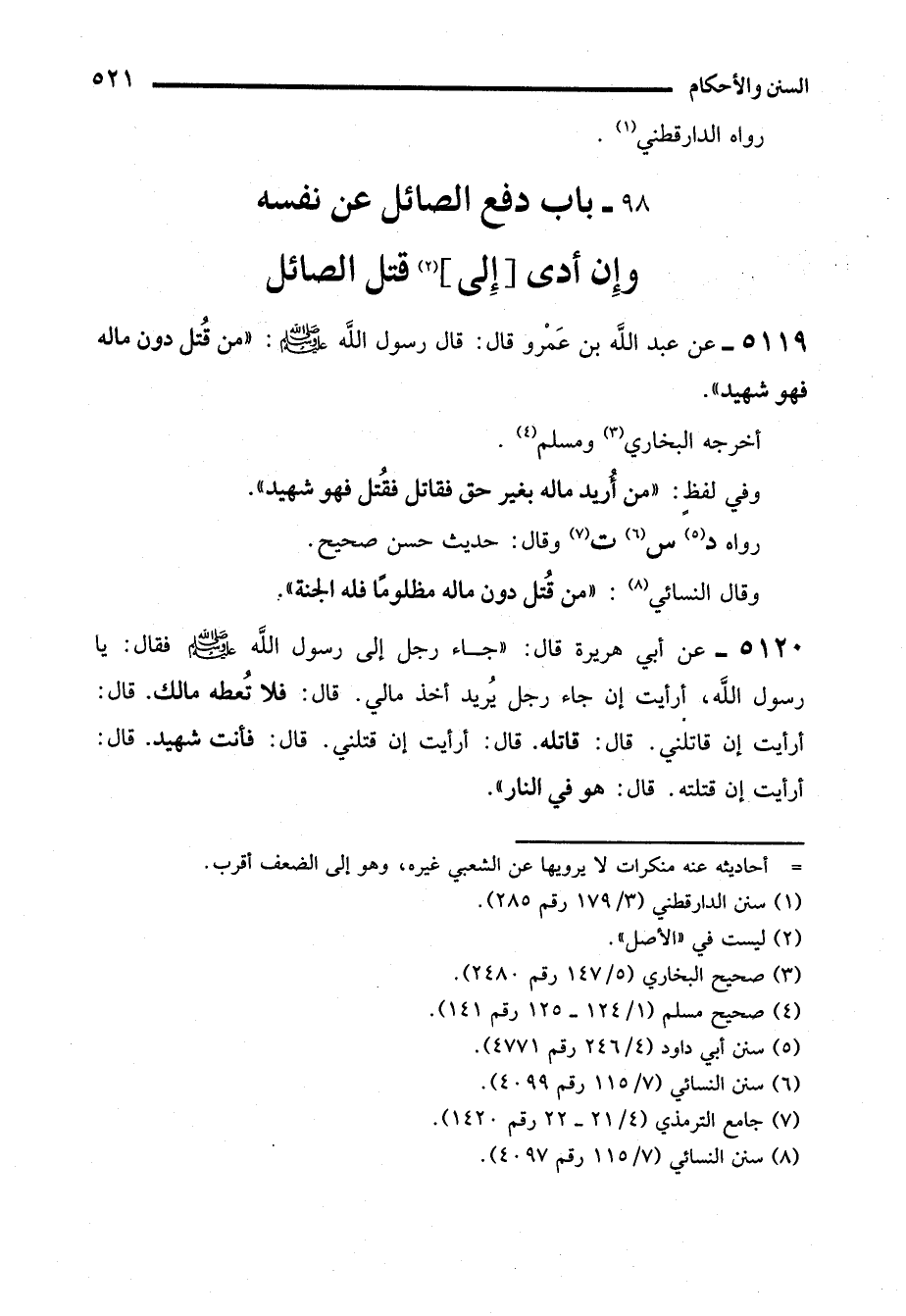 5120 - عن أبي هريرة قال: "جاء رجل إلى رسول الله - صلى الله عليه وسلم -، فقال: يا رسول الله، أرأيت إن جاء رجل يُريد أخذ مالي. قال: فلا تُعطه مالك. قال: أرأيت إن قاتلني. قال: قاتله. قال: أرأيت إن قتلني. قال: فأنت شهيد. قال: أرأيت إن قتلته. قال: هو في النار".