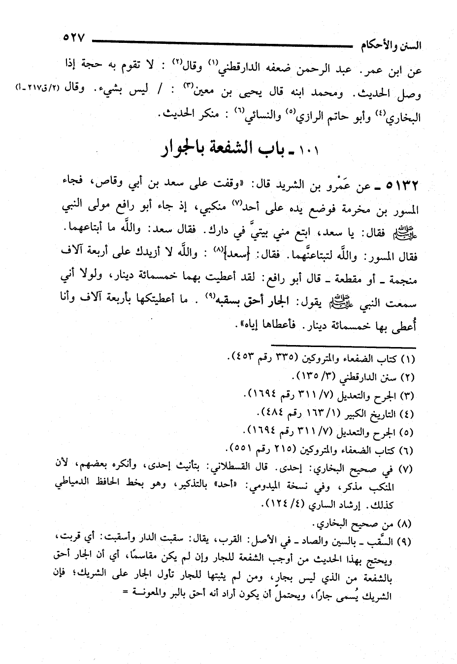 5132 - عن عَمْرو بن الشريد قال: "وقفت على سعد بن أبي وقاص، فجاء المسور بن مخرمة فوضع يده على أحد (¬7) منكبي، إذ جاء أبو رافع مولى النبي - صلى الله عليه وسلم -، فقال: يا سعد، ابتع مني بيتيَّ في دارك. فقال سعد: والله ما أبتاعهما. فقال المسور: والله لتبتاعنَّهما. فقال: (سعد) (¬8): والله لا أزيدك على أربعة آلاف منجمة -أو مقطعة- قال أبو رافع: لقد أعطيت بهما خمسمائة دينار، ولولا أني سمعت النبي - صلى الله عليه وسلم - يقول: الجار أحق بسقبه (¬9). ما أعطيتكها بأربعة آلاف وأنا أُعطى بها خمسمائة دينار. فأعطاها إياه".