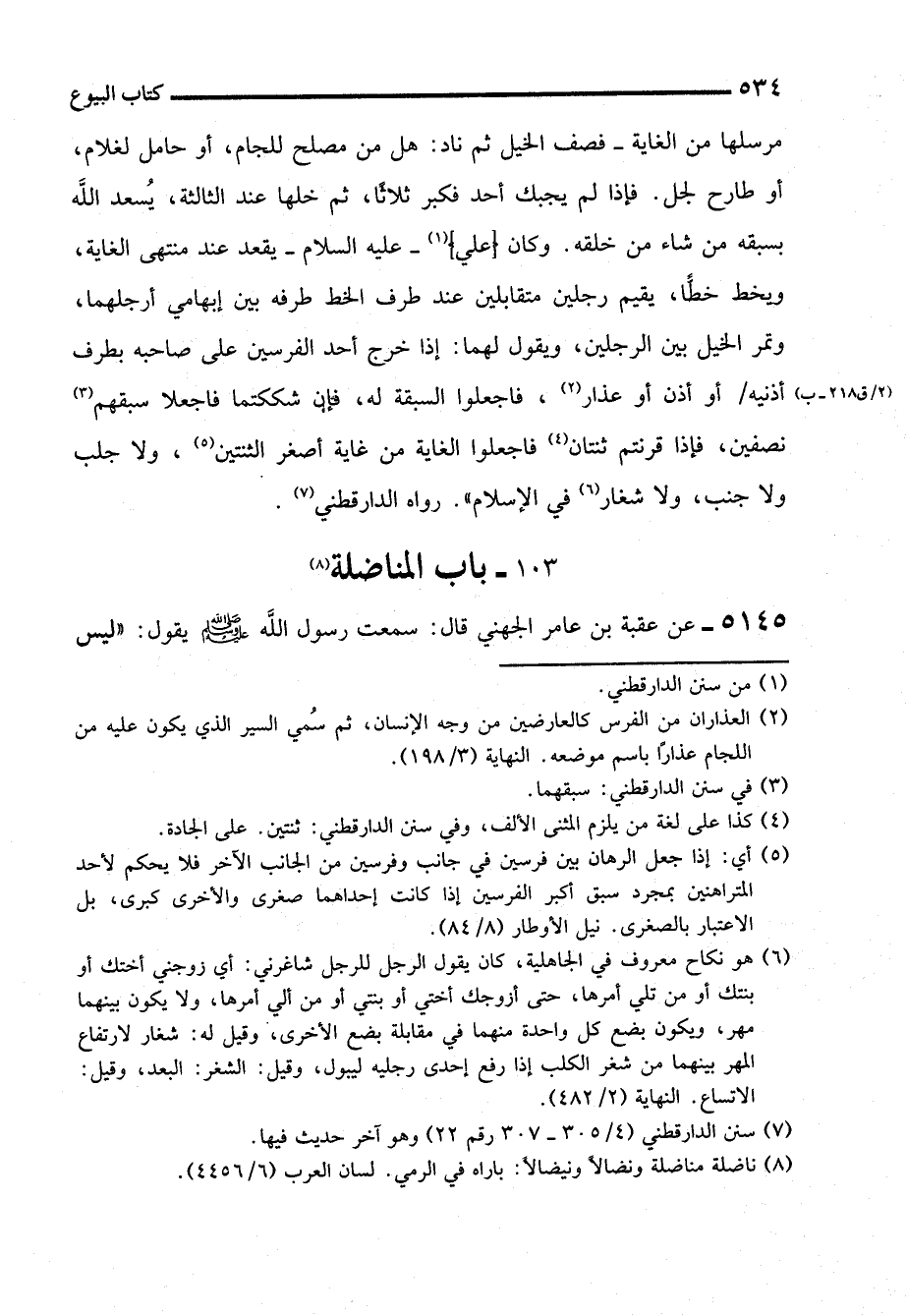 (¬5) أي: إذا جعل الرهبان بين فرسين في جانب وفرسين من الجانب الآخر فلا يحكم لأحد المتراهنين بمجرد سبق أكبر الفرسين إذا كانت إحداهما صغرى والأخرى كبرى، بل الاعتبار بالصغرى. نيل الأوطار (8/ 84).
