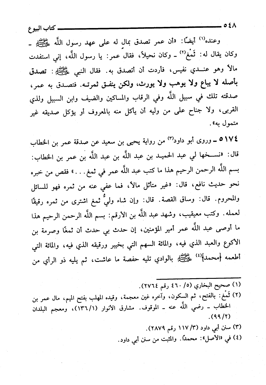 5174 - وروى أبو داود (¬3) من رواية يحيى بن سعيد عن صدقة عمر بن الخطاب قال: "نسخها لي عبد الحميد بن عبد الله بن عبد الله بن عمر بن الخطاب: بسم الله الرحمن الرحيم هذا ما كتب عبد الله عمر في ثمغ ... " فقص من خبره نحو حديث نافع، قال: "غير متأثل مالاً، فما عفي عنه من ثمره فهو للسائل والمحروم. قال: وساق القصة. قال: وإن شاء وليُّ ثمغ اشترى من ثمره رقيقًا لعمله. وكتب معيقيب، وشهد عبد الله بن الأرقم: بسم الله الرحمن الرحيم هذا ما أوصى عبد الله عمر أمير المؤمنين، إن حدث بي حدث أن ثمغًا وصرمة بن الأكوع والعبد الذي فيه، والمائة السهم التي بخيبر ورقيقه الذي فيه، والمائة التي أطعمه (محمد) (¬4) - صلى الله عليه وسلم - بالوادي تليه حفصة ما عاشت، ثم يليه ذو الرأي من