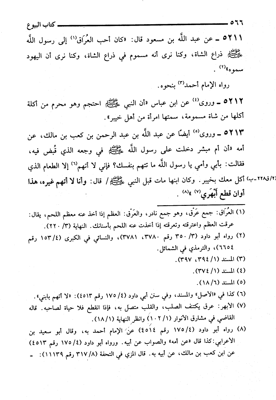 5211 - عن عبد الله بن مسعود قال: "كان أحب العُرَاق (¬1) إلى رسول الله - صلى الله عليه وسلم - ذراع الشاة، وكنا نرى أنه مسموم في ذراع الشاة، وكنا نرى أن اليهود سموه" (¬2).