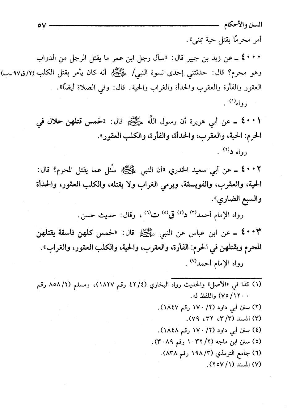 4002 - عن أبي سعيد الخدري "أن النبي - صلى الله عليه وسلم - سُئل عما يقتل المحرم؟ قال: الحية، والعقرب، والفويسقة، ويرمي الغراب ولا يقتله، والكلب العقور، والحدأة والسبع الضاري".