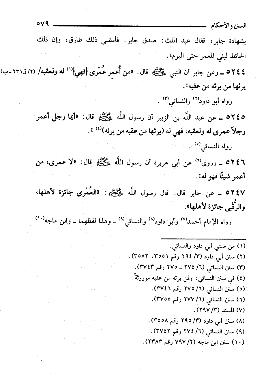 5247 - عن جابر قال: قال رسول الله - صلى الله عليه وسلم -: "العُمْرى جائزة لأهلها، والرُّقبى جائزة لأهلها".