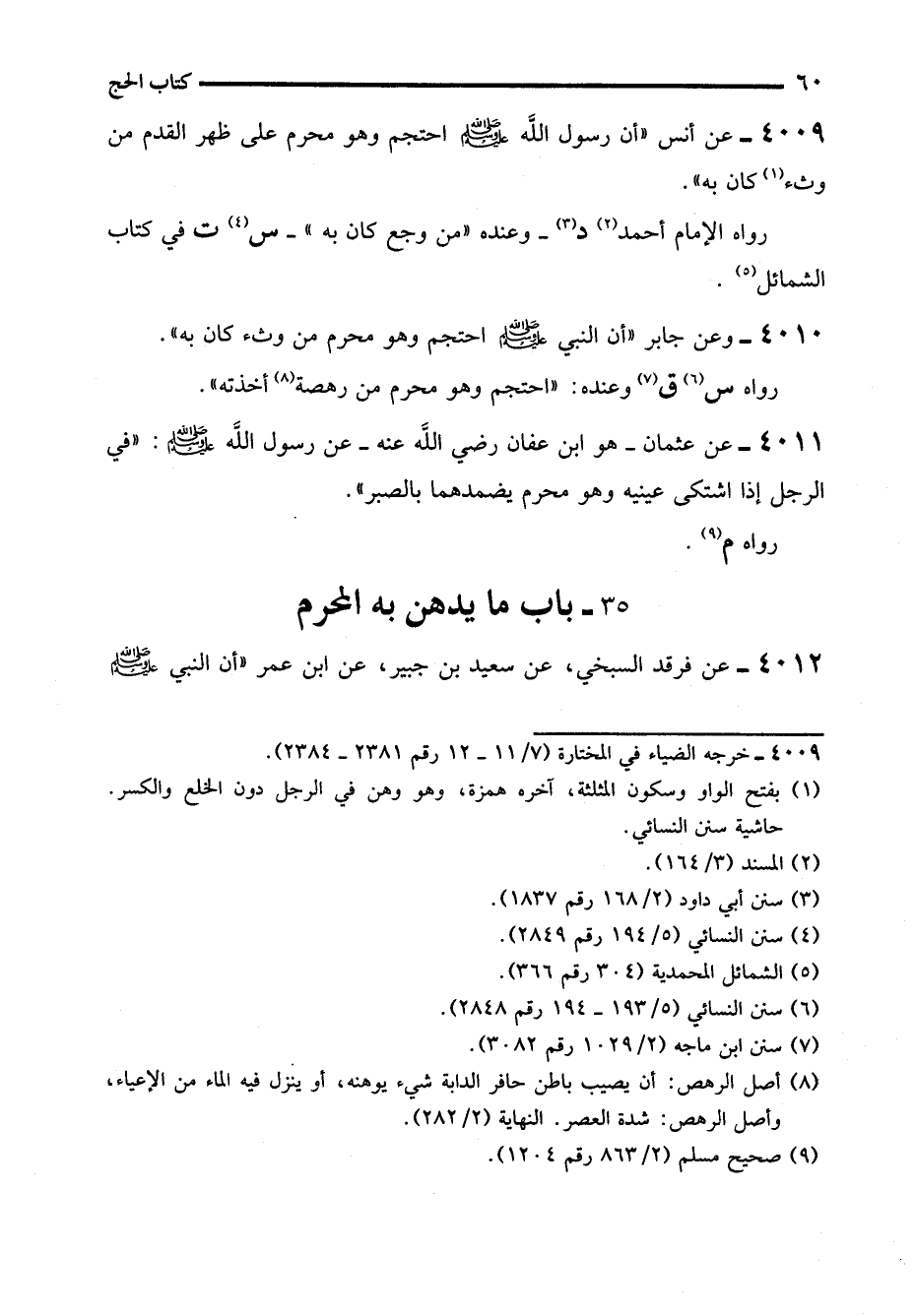 4009 - عن أنس "أن رسول الله - صلى الله عليه وسلم - احتجم وهو محرم على ظهر القدم من وثء (¬1) كان به".