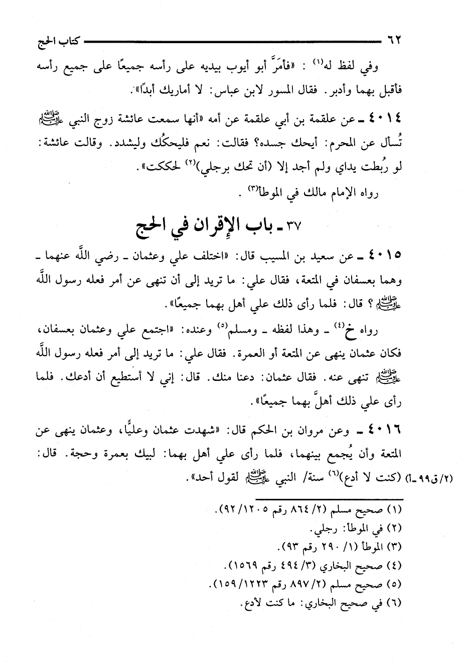 4015 - عن سعيد بن المسيب قال: "اختلف علي وعثمان -رضي الله عنهما- وهما بعسفان في المتعة، فقال علي: ما تريد إلى أن تنهى عن أمر فعله رسول الله - صلى الله عليه وسلم -؟ قال: فلما رأى ذلك علي أهل بهما جميعًا".