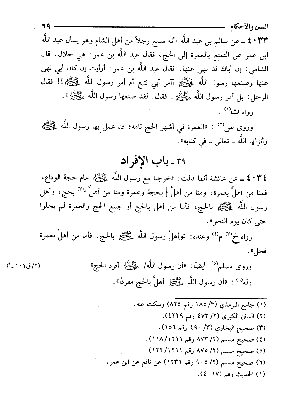 4033 - عن سالم بن عبد الله "أنه سمع رجلاً من أهل الشام وهو يسأل عبد الله ابن عمر عن التمتع بالعمرة إلى الحج، فقال عبد الله بن عمر: هي حلال. قال الشامي: إن أباك قد نهى عنها. فقال عبد الله بن عمر: أرأيت إن كان أبي نهى عنها وصنعها رسول الله - صلى الله عليه وسلم - أأمر أبي نتبع أم أمر رسول الله - صلى الله عليه وسلم -؟! فقال الرجل: بل أمر رسول الله - صلى الله عليه وسلم -. فقال: لقد صنعها رسول الله - صلى الله عليه وسلم -".