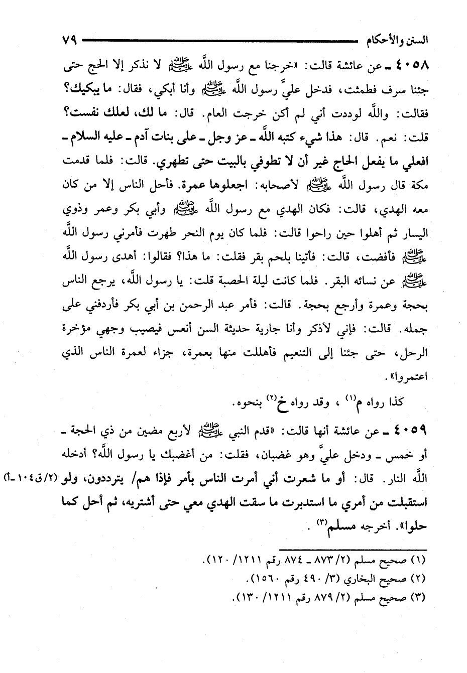 4059 - عن عائشة أنها قالت: "قدم النبي - صلى الله عليه وسلم - لأربع مضين من ذي الحجة -أو خمس- ودخل عليَّ وهو غضبان، فقلت: من أغضبك يا رسول الله؟ أدخله الله النار. قال: أو ما شعرت أني أمرت الناس بأمر فإذا هم يترددون، ولو استقبلت من أمري ما استدبرت ما سقت الهدي معي حتى أشتريه، ثم أحل كما حلوا". أخرجه مسلم (¬3).