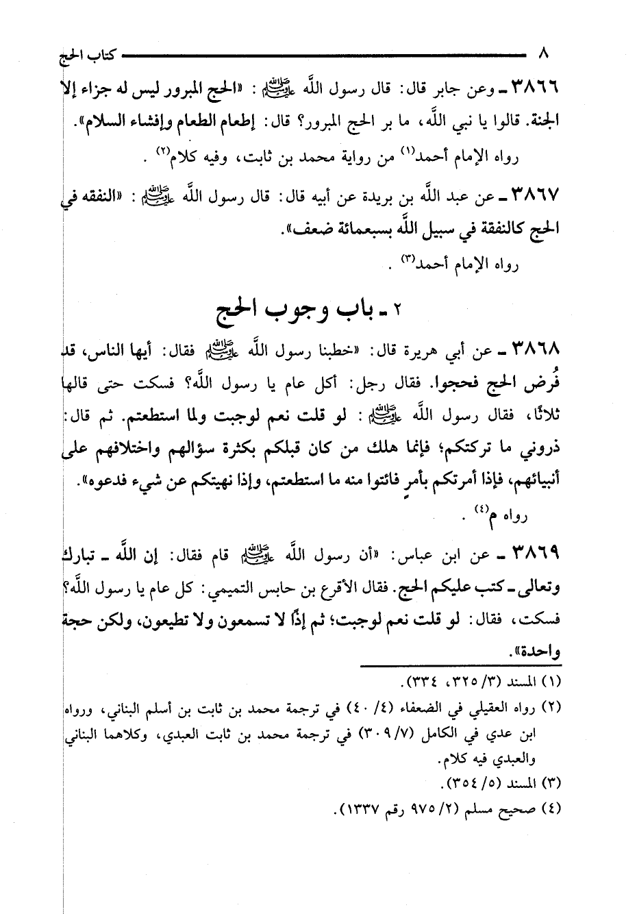 3869 - عن ابن عباس: "أن رسول الله - صلى الله عليه وسلم - قام فقال: إن الله -تبارك وتعالى- كتب عليكم الحج. فقال الأقرع بن حابس التميمي: كل عام يا رسول الله؟ فسكت، فقال: لو قلت نعم لوجبت؛ ثم إذًا لا تسمعون ولا تطيعون، ولكن حجة واحدة".