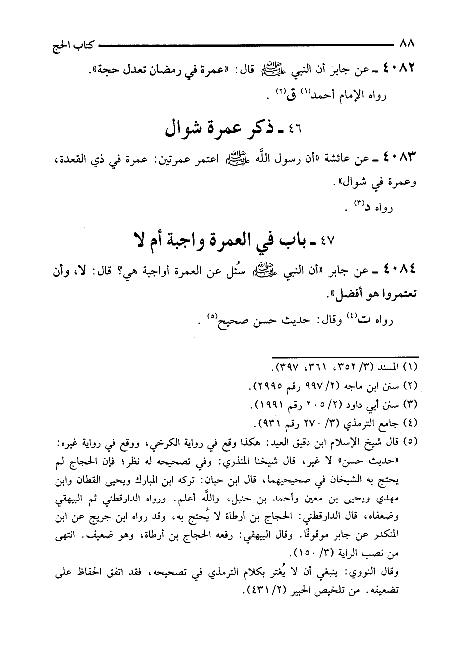 4084 - عن جابر "أن النبي - صلى الله عليه وسلم - سُئل عن العمرة واجبة هي؟ قال: لا، وأن تعتمروا هو أفضل".