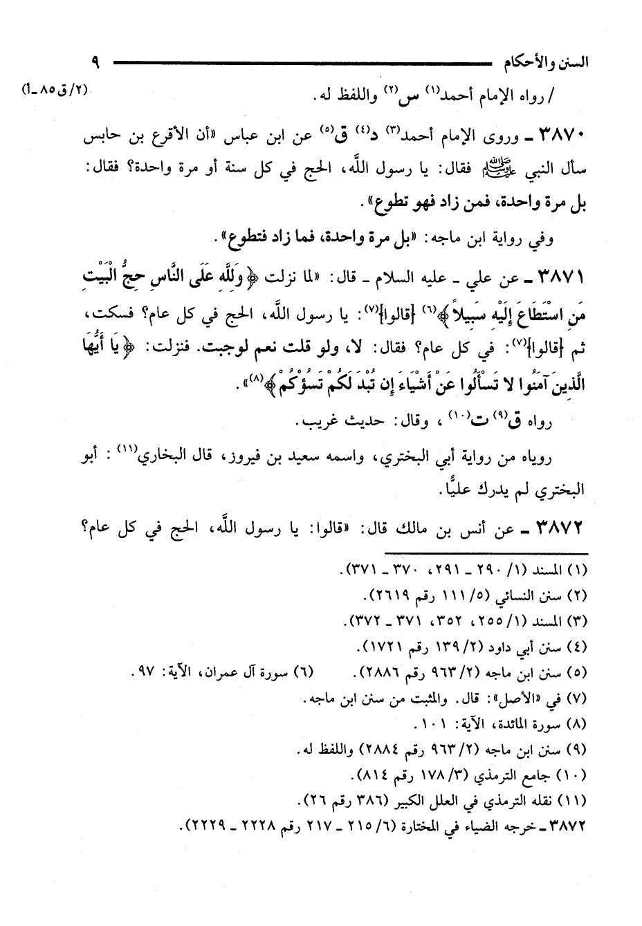 3871 - عن علي -رضي الله عنه- قال: "لما نزلت {وَلِلَّهِ عَلَى النَّاسِ حِجُّ الْبَيْتِ مَنِ اسْتَطَاعَ إِلَيْهِ سَبِيلًا} (¬6) قالوا (¬7): يا رسول الله، الحج في كل عام؟ فسكت، ثم (قالوا) (7): في كل عام؟ فقال: لا، ولو قلت نعم لوجبت. فنزلت: {يَا أَيُّهَا الَّذِينَ آمَنُوا لَا تَسْأَلُوا عَنْ أَشْيَاءَ إِنْ تُبْدَ لَكُمْ تَسُؤْكُمْ} (¬8) ".