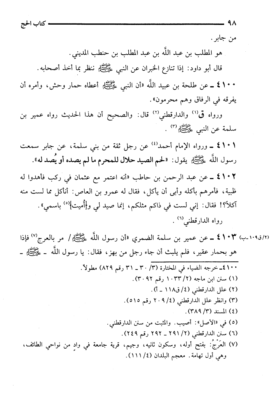 4103 - عن عمير بن سلمة الضمري "أن رسول الله - صلى الله عليه وسلم - مر بالعرج (¬7) فإذا بحمار عقير، فلم يلبث أن جاء رجل من بهز، فقال: يا رسول الله - صلى الله عليه وسلم -