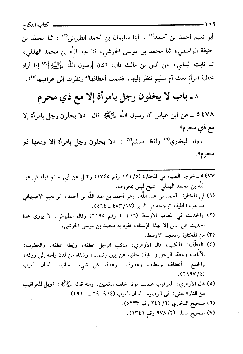 5478 - عن ابن عباس أن رسول الله - صلى الله عليه وسلم - قال: "لا يخلون رجل بامرأة إلا مع ذي محرم".