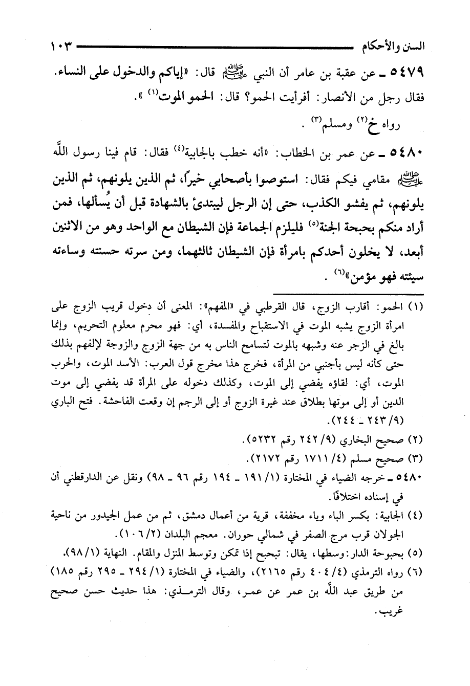 5479 - عن عقبة بن عامر أن النبي - صلى الله عليه وسلم - قال: "إياكم والدخول على النساء. فقال رجل من الأنصار: أفرأيت الحمو؟ قال: الحمو الموت (¬1) ".