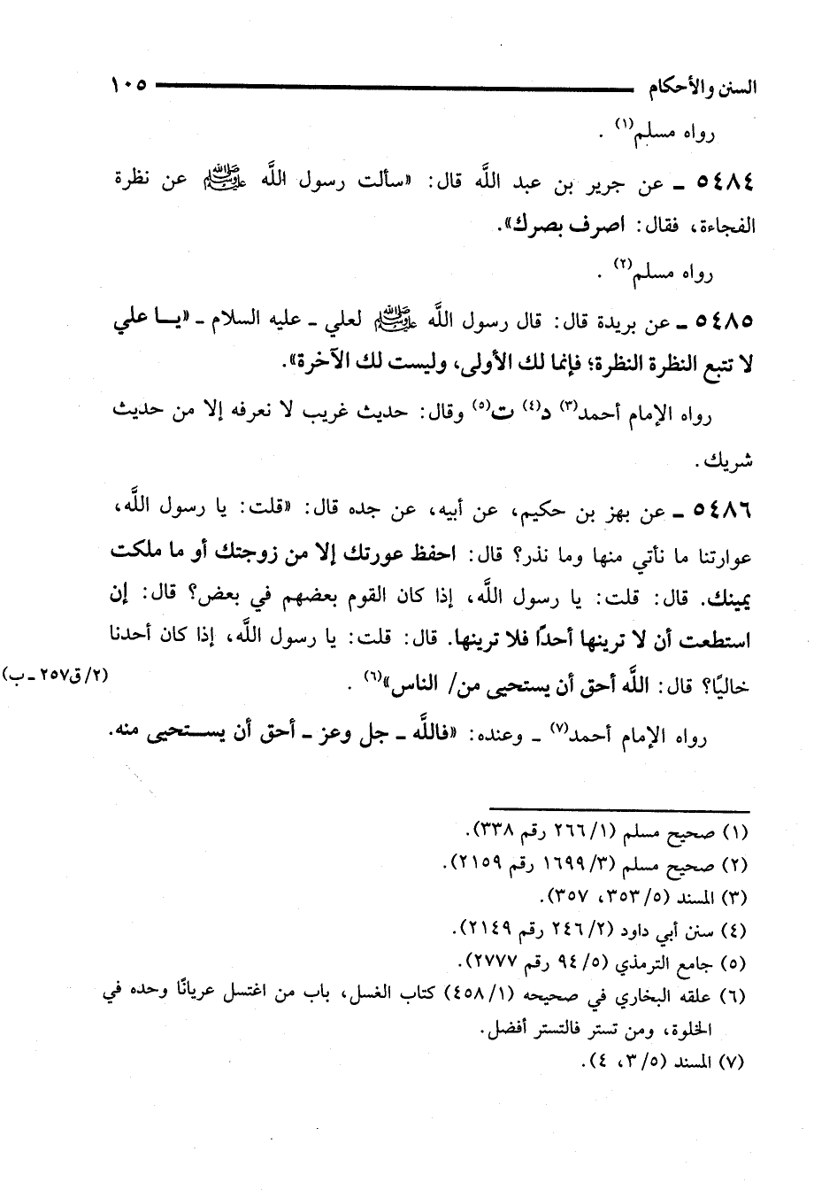 5486 - عن بهز بن حكيم، عن أبيه، عن جده قال: "قلت: يا رسول الله، عوارتنا ما نأتي منها وما نذر؟ قال: احفظ عورتك إلا من زوجتك أو ما ملكت يمينك. قال: قلت: يا رسول الله، إذا كان القوم بعضهم في بعض؟ قال: إن استطعت أن لا ترينها أحداً فلا ترينها. قال: قلت: يا رسول الله، إذا كان أحدنا خاليًا؟ قال: الله أحق أن يستحى من الناس" (¬6).