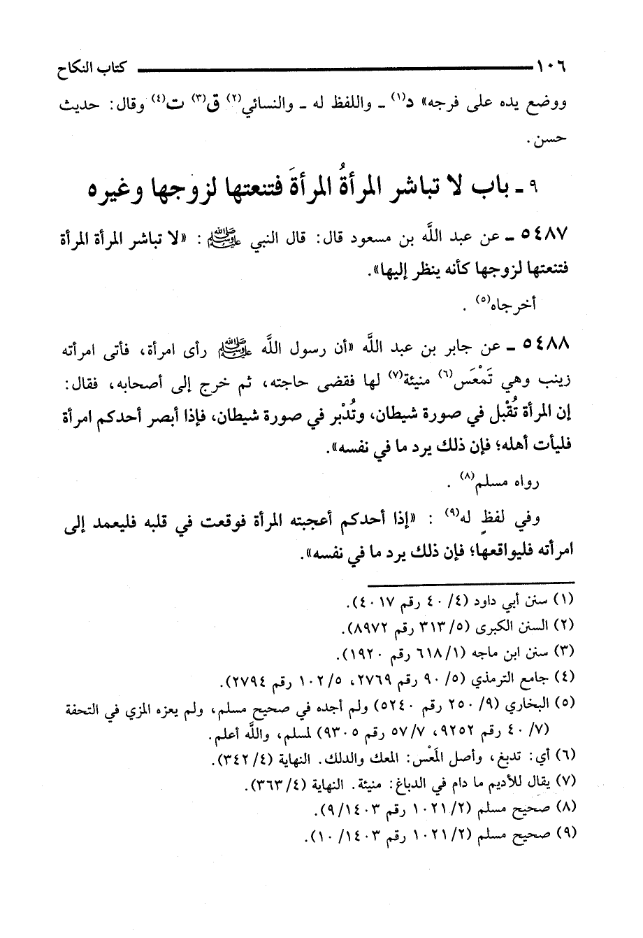 5487 - عن عبد الله بن مسعود قال: قال النبي - صلى الله عليه وسلم -: "لا تباشر المرأة المرأة فتنعتها لزوجها كأنه ينظر إليها".