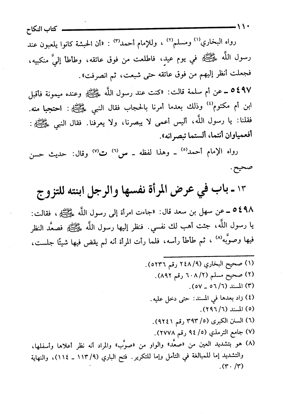 5498 - عن سهل بن سعد قال: "جاءت امرأة إلى رسول الله - صلى الله عليه وسلم -، فقالت: يا رسول الله، جئت أهب لك نفسي. فنظر إليها رسول الله - صلى الله عليه وسلم - فصعَّد النظر فيها وصوَّبه (¬8)، ثم طأطأ رأسه، فلما رأت المرأة أنه لم يقض فيها شيئًا جلست،