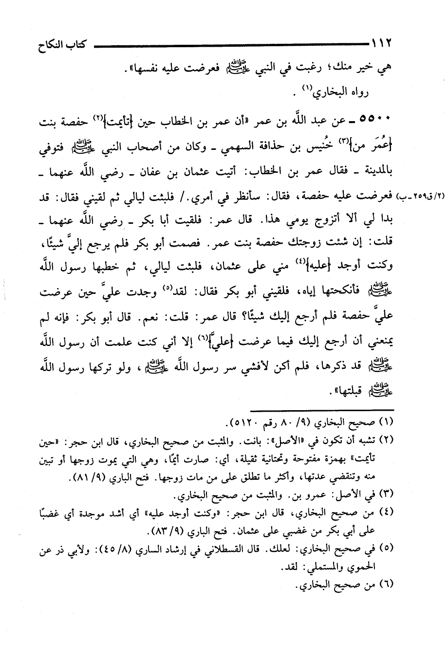 5500 - عن عبد الله بن عمر أن عمر بن الخطاب حين (تأيمت) (¬2) حفصة بنت (عُمَر من) (¬3) خُنيس بن حذافة السهمي -وكان من أصحاب النبي - صلى الله عليه وسلم - فتوفي بالمدينة- فقال عمر بن الخطاب: أتيت عثمان بن عفان -رضي الله عنهما- فعرضت عليه حفصة، فقال: سأنظر في أمري. فلبثت ليالي ثم لقيني فقال: قد بدا لي ألا أتزوج يومي هذا. قال عمر: فلقيت أبا بكر -رضي الله عنهما- قلت: إن شئت زوجتك حفصة بنت عمر. فصمت أبو بكر فلم يرجع إليَّ شيئًا، وكنت أوجد (عليه) (¬4) مني على عثمان، فلبثت ليالي، ثم خطبها رسول الله - صلى الله عليه وسلم - فأنكحتها إياه، فلقيني أبو بكر فقال: لقد (¬5) وجدت عليَّ حين عرضت علي حفصة فلم أرجع إليك شيئاً؟ قال عمر: قلت: نعم. قال أبو بكر: فإنه لم يمنعني أن أرجع إليك فيما عرضت (عليَّ) (¬6) إلا أني كنت علمت أن رسول الله - صلى الله عليه وسلم - قد ذكرها، فلم أكن لأفشي سر رسول الله - صلى الله عليه وسلم -، ولو تركها رسول الله - صلى الله عليه وسلم - قبلتها".