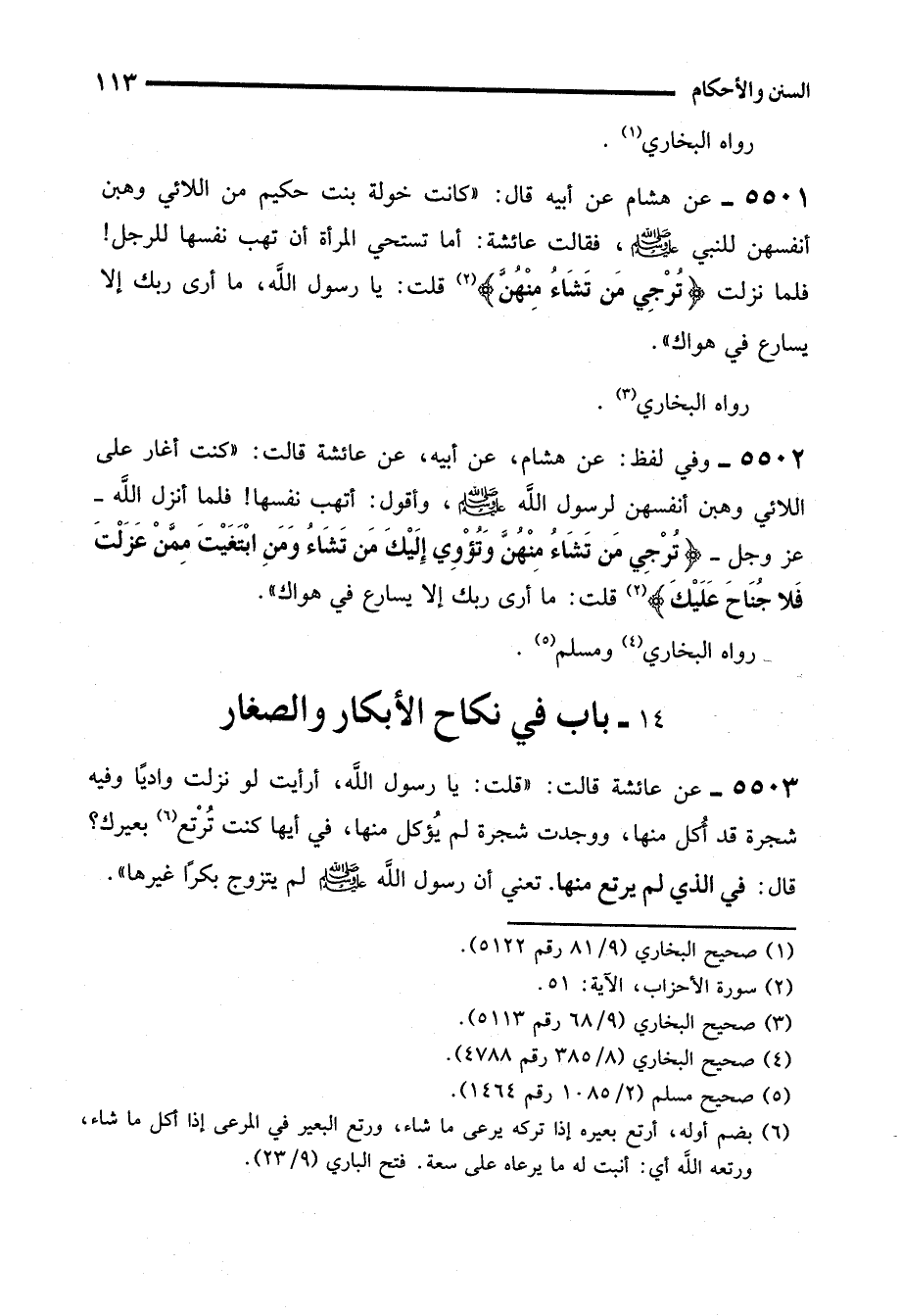 5502 - وفي لفظ: عن هشام، عن أبيه، عن عائشة قالت: "كنت أغار على اللائي وهبن أنفسهن لرسول الله - صلى الله عليه وسلم -، وأقول: أتهب نفسها! فلما أنزل الله -عز وجل- {تُرْجِي مَنْ تَشَاءُ مِنْهُنَّ وَتُؤْوِي إِلَيْكَ مَنْ تَشَاءُ وَمَنِ ابْتَغَيْتَ مِمَّنْ عَزَلْتَ فَلَا جُنَاحَ عَلَيْكَ} (2) قلت: ما أرى ربك إلا يسارع في هواك".
