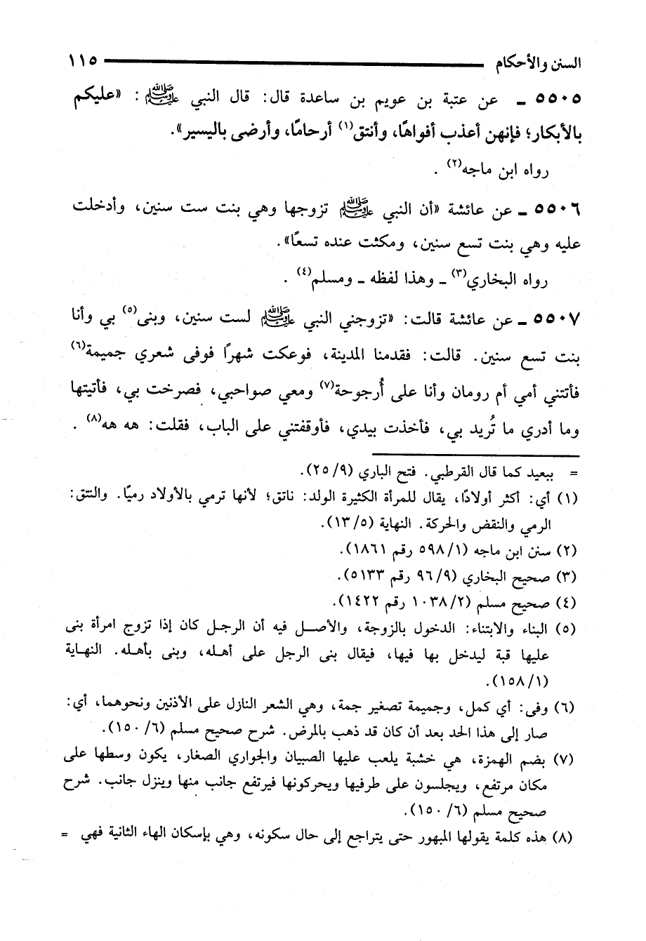 5506 - عن عائشة "أن النبي - صلى الله عليه وسلم - تزوجها وهي بنت ست سنين، وأدخلت عليه وهي بنت تسع سنين، ومكثت عنده تسعًا".