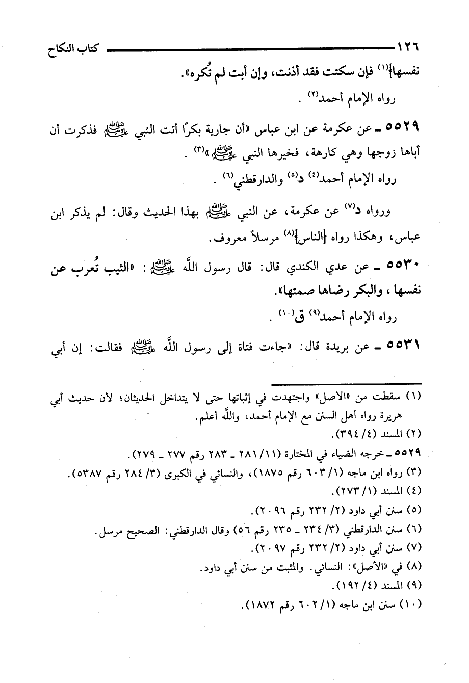 5530 - عن عدي الكندي قال: قال رسول الله - صلى الله عليه وسلم -: "الثيب تُعرب عن نفسها، والبكر رضاها صمتها".