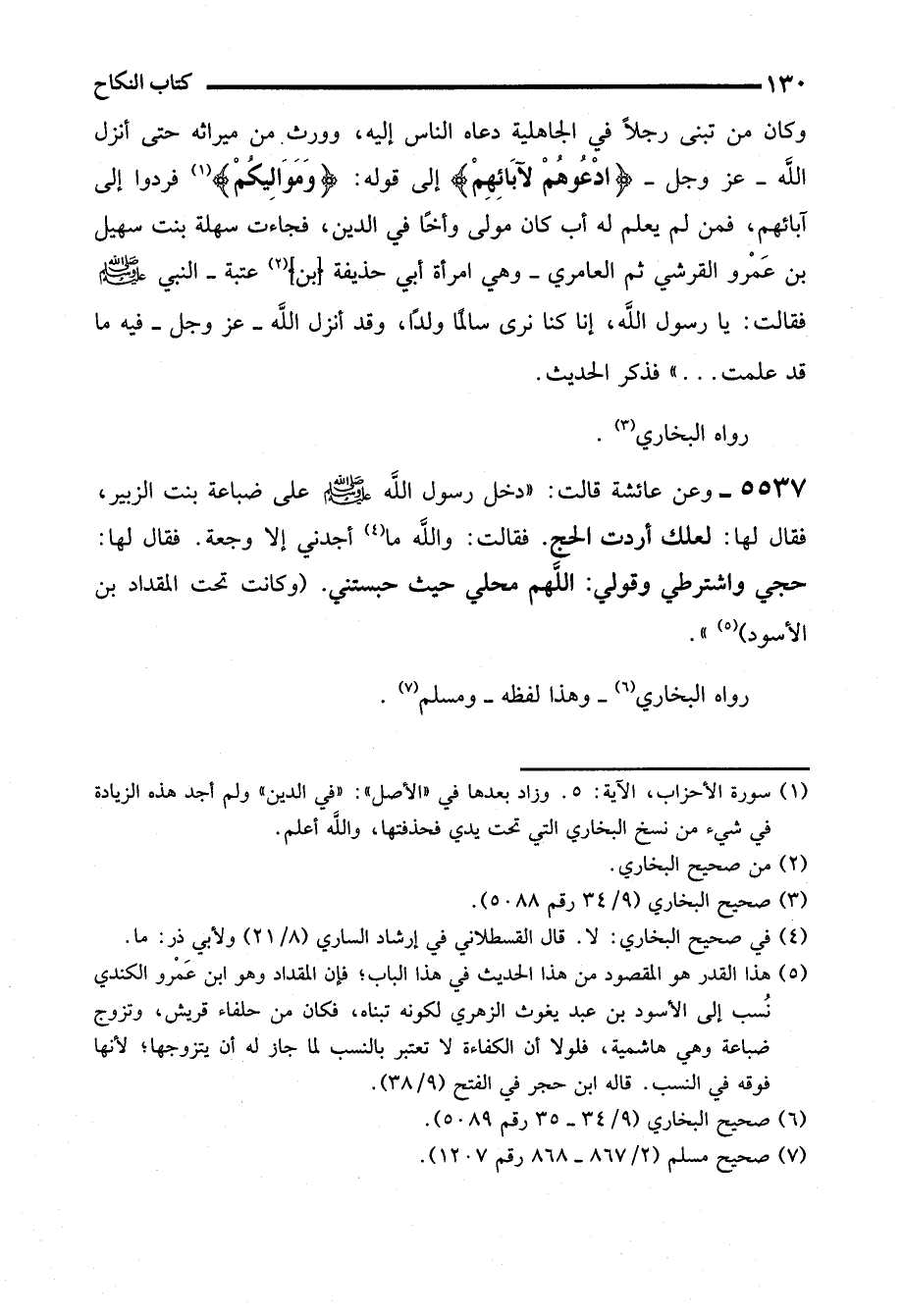 (¬5) هذا القدر هو المقصود من هذا الحديث في هذا الباب؛ فإن المقداد وهو ابن عَمْرو الكندي نُسب إلى الأسود بن عبد يغوث الزهري لكونه تبناه، فكان من حلفاء قريش، وتزوج ضباعة وهي هاشمية، فلولا أن الكفاءة لا تعتبر بالنسب لما جاز له أن يتزوجها؛ لأنها فوقه في النسب. قاله ابن حجر في الفتح (9/ 38).