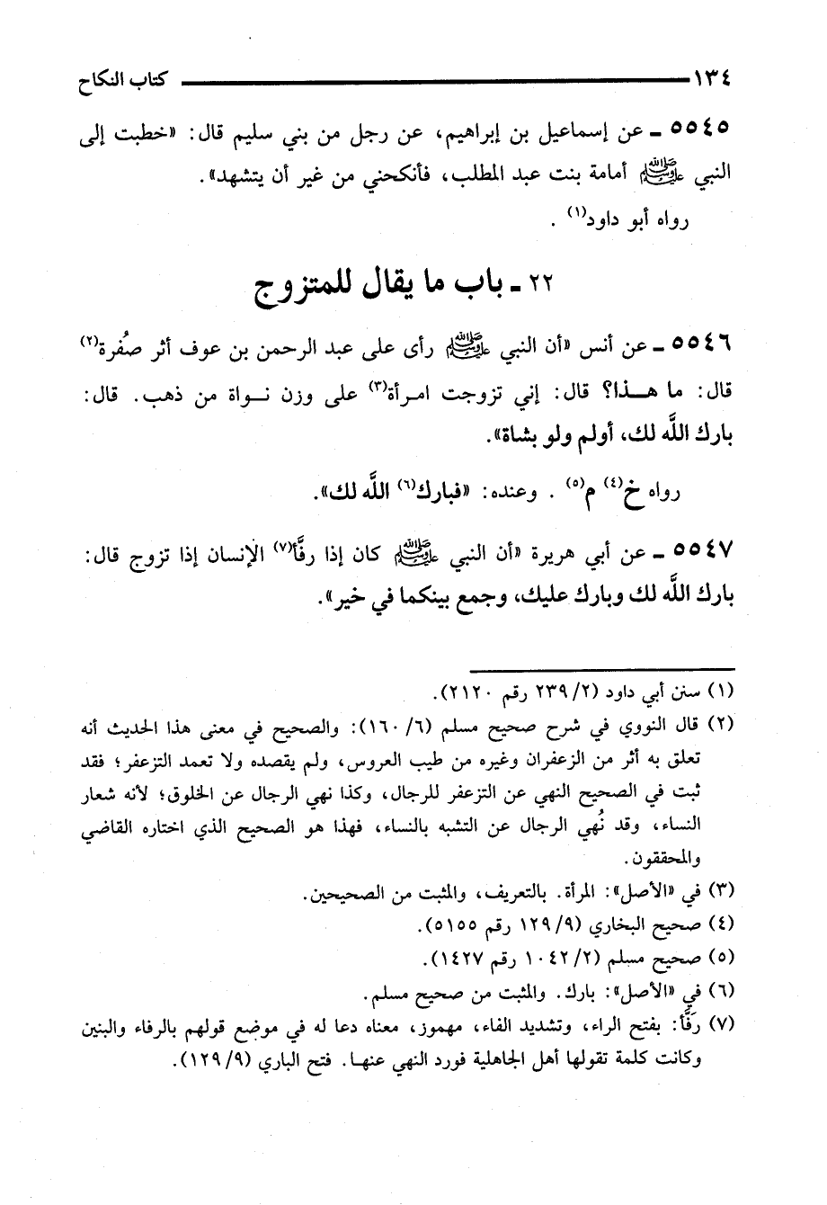 5546 - عن أنس "أن النبي - صلى الله عليه وسلم - رأى على عبد الرحمن بن عوف أثر صُفرة (¬2) قال: ما هذا؟ قال: إني تزوجت امرأة (¬3) على وزن نواة من ذهب. قال: بارك الله لك، أولم ولو بشاة".