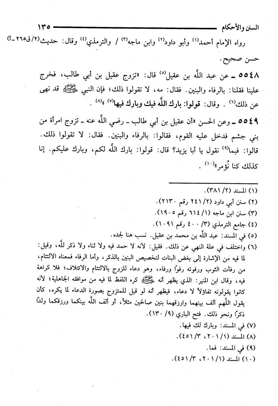 5548 - عن عبد الله بن عقيل (¬5) قال: "تزوج عقيل بن أبي طالب، فخرج علينا فقلنا: بالرفاء والبنين. فقال: مه، لا تقولوا ذلك؛ فإن النبي - صلى الله عليه وسلم - قد نهى عن ذلك (¬6). وقال: قولوا: بارك الله فيك وبارك فيها (¬7) " (¬8).