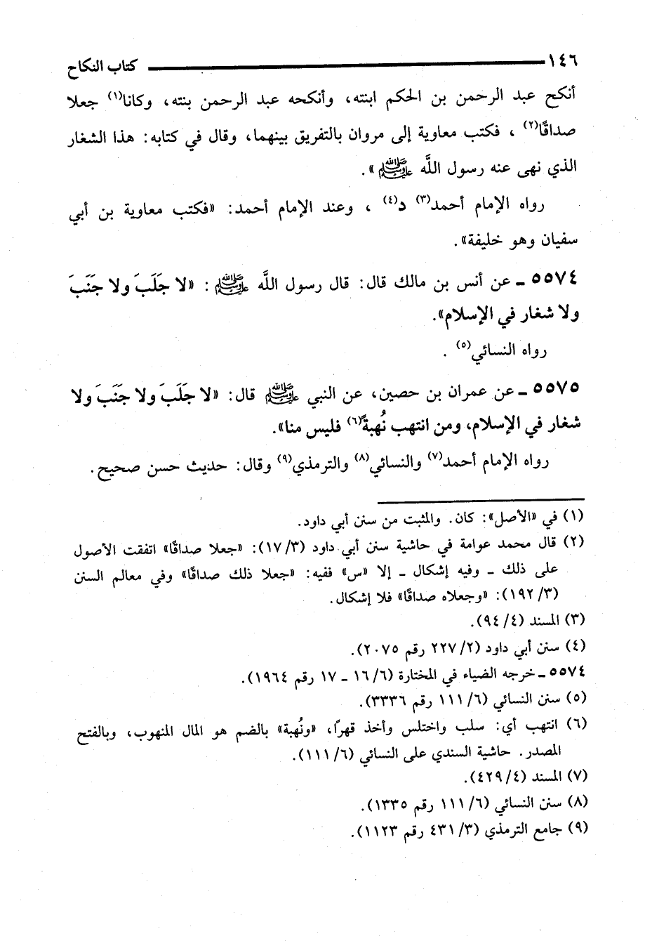 5574 - عن أنس بن مالك قال: قال رسول الله - صلى الله عليه وسلم -: "لا جَلَبَ ولا جَنَبَ ولا شغار في الإسلام".