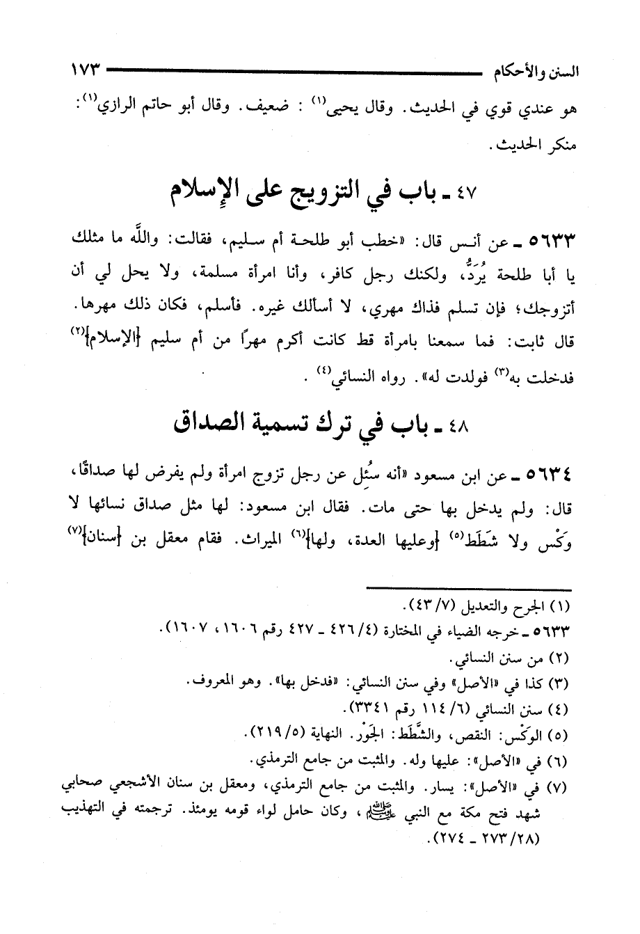5633 - عن أنس قال: "خطب أبو طلحة أم سليم، فقالت: والله ما مثلك يا أبا طلحة يُرَدُّ، ولكنك رجل كافر، وأنا امرأة مسلمة، ولا يحل لي أن أتزوجك؛ فإن تسلم فذاك مهري، لا أسألك غيره. فأسلم، فكان ذلك مهرها. قال ثابت: فما سمعنا بامرأة قط كانت أكرم مهرًا من أم سليم (الإسلام) (¬2) فدخلت به (¬3) فولدت له". رواه النسائي (¬4).