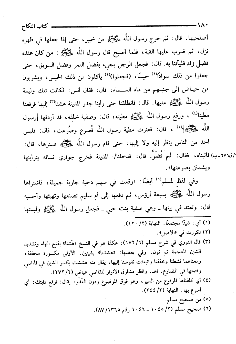 أصلحيها. قال: ثم خرج رسول الله - صلى الله عليه وسلم - من خيبر، حتى إذا جعلها في ظهره نزل، ثم ضرب عليها القبة، فلما أصبح قال رسول الله - صلى الله عليه وسلم -: من كان عنده فضل زاد فليأتنا به. قال: فجعل الرجل يجيء بفضل التمر وفضل السويق، حتى جعلوا من ذلك سوادًا (¬1) حيسًا، (فجعلوا) (¬2) يأكلون من ذلك الحيس، ويشربون من حياض إلى جنبهم من ماء السماء، قال: فقال أنس: فكانت تلك وليمة رسول الله - صلى الله عليه وسلم - عليها. قال: فانطلقنا حتى رأينا جدر المدينة هشنا (¬3) إليها فرفعنا مطينا (¬4)، ورفع رسول الله - صلى الله عليه وسلم - مطيته، قال: وصفية خلفه، قد أردفها (رسول الله - صلى الله عليه وسلم -) (¬5)، قال: فعثرت مطية رسول الله فُصرع وصُرعت، قال: فليس أحد من الناس ينظر إليه ولا إليها، حتى قام رسول الله - صلى الله عليه وسلم - فسترها، قال: فأتيناه، فقال: لم نُضَرَّ قال: فدخلنا المدينة فخرج جواري نسائه يترأينها ويشمتن بصرعتها".