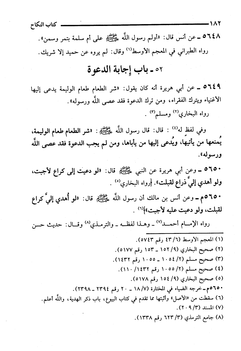 5650 م- وعن أنس بن مالك أن رسول الله - صلى الله عليه وسلم - قال: "لو أُهدي إليَّ كراع لقبلت، ولو دعيت عليه لأجبت") (¬6).