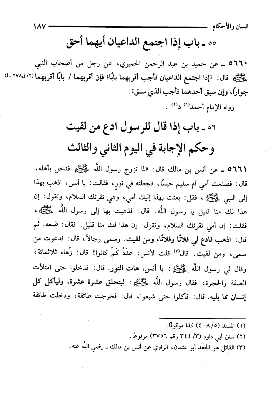 5660 - عن حميد بن عبد الرحمن الحميري، عن رجل من أصحاب النبي - صلى الله عليه وسلم - قال: "إذا اجتمع الداعيان فأجب أقربهما بابًا؛ فإن أقربهما باباً أقربهما جواراً، وإن سبق أحدهما فأجب الذي سبق".