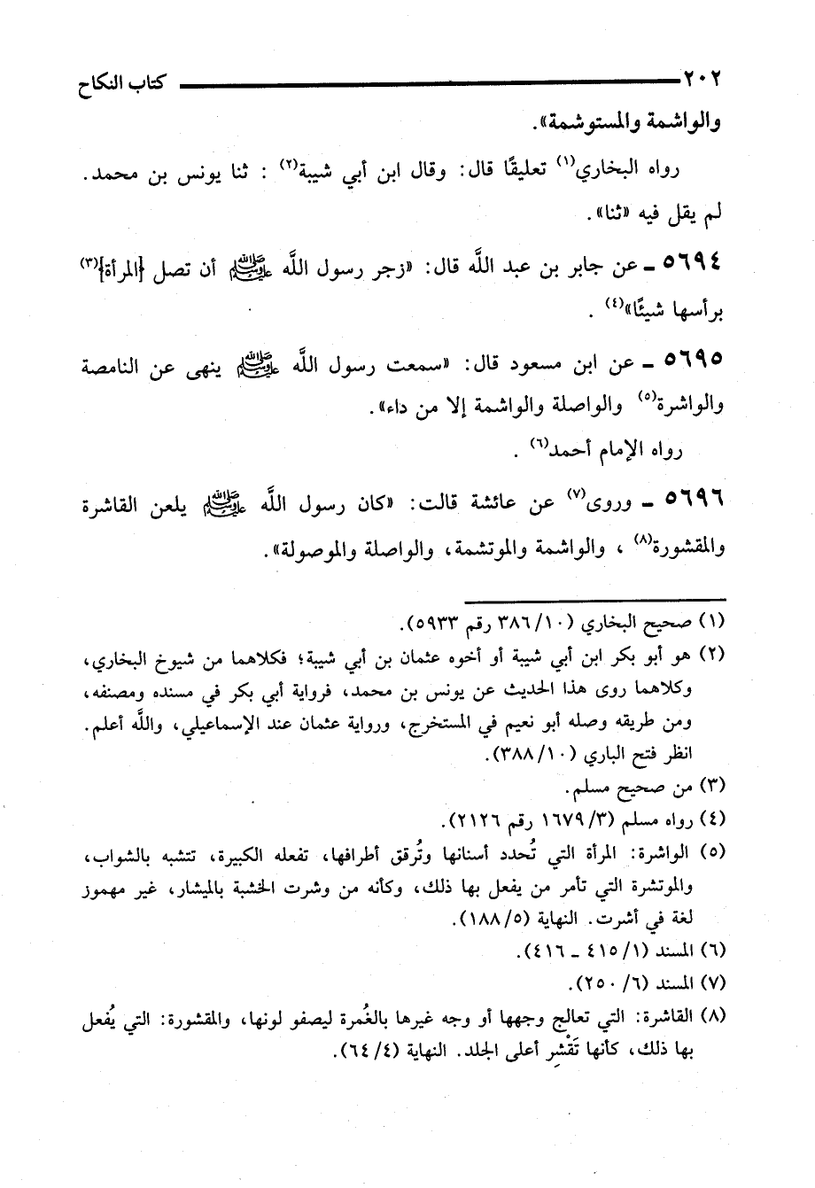 5694 - عن جابر بن عبد الله قال: "زجر رسول الله - صلى الله عليه وسلم - أن تصل (المرأة) (¬3) برأسها شيئًا" (¬4).