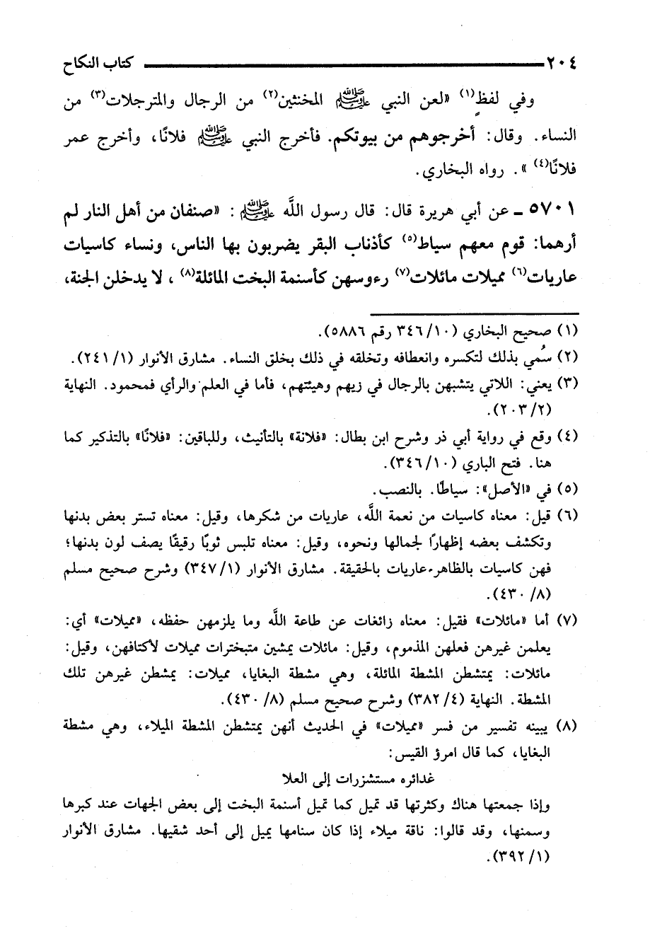 (¬6) قيل: معناه كاسيات من نعمة الله، عاريات من شكرها، وقيل: معناه تستر بعض بدنها وتكشف بعضه إظهارًا لجمالها ونحوه، وقيل: معناه تلبس ثوباً رقيقًا يصف لون بدنها؛ فهن كاسيات بالظاهر. عاريات بالحقيقة. مشارق الأنوار (1/ 347) وشرح صحيح مسلم (8/ 430).