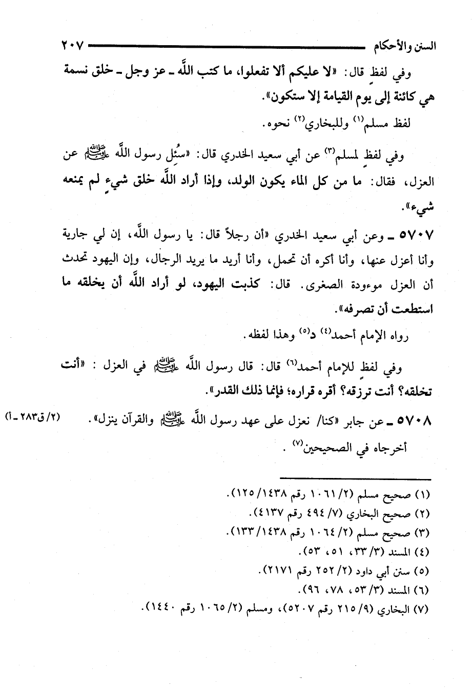 5707 - وعن أبي سعيد الخدري "أن رجلاً قال: يا رسول الله، إن لي جارية وأنا أعزل عنها، وأنا أكره أن تحمل، وأنا أريد ما يريد الرجال، وإن اليهود تحدث أن العزل موءودة الصغرى. قال: كذبت اليهود، لو أراد الله أن يخلقه ما استطعت أن تصرفه".