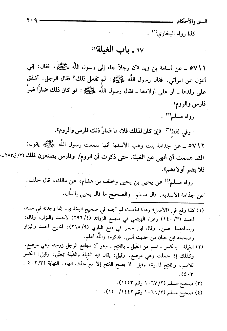 5711 - عن أسامة بن زيد "أن رجلاً جاء إلى رسول الله - صلى الله عليه وسلم -، فقال: إني أعزل عن امرأتي. فقال رسول الله - صلى الله عليه وسلم -: لم تفعل ذلك؟ فقال الرجل: أشفق على ولدها -أو على أولادها- فقال رسول الله - صلى الله عليه وسلم -: لو كان ذلك ضارًّا ضرَّ فارس والروم".