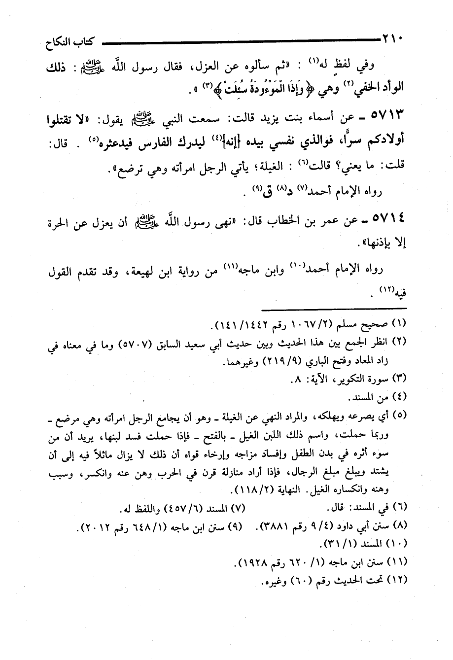 5714 - عن عمر بن الخطاب قال: "نهى رسول الله - صلى الله عليه وسلم - أن يعزل عن الحرة إلا بإذنها".