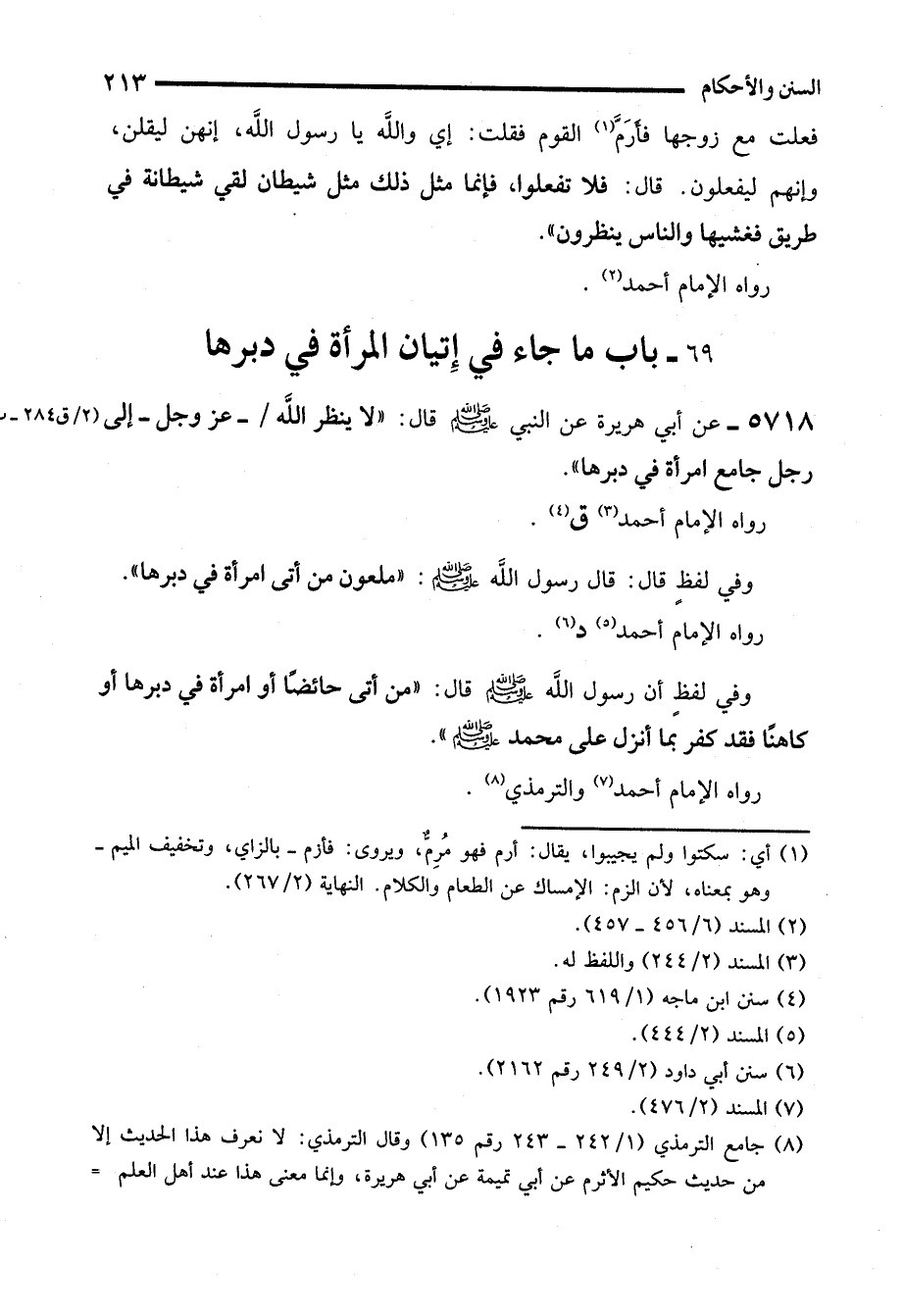 5718 - عن أبي هريرة عن النبي - صلى الله عليه وسلم - قال: "لا ينظر الله -عز وجل- إلى رجل جامع امرأة في دبرها".