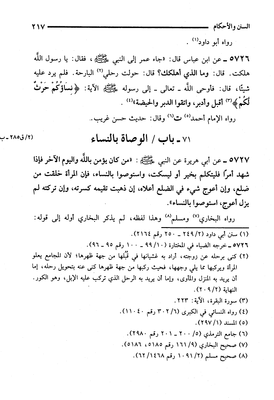 5726 - عن ابن عباس قال: "جاء عمر إلى النبي - صلى الله عليه وسلم -، فقال: يا رسول الله هلكت. قال: وما الذي أهلكك؟ قال: حولت رحلي (¬2) البارحة. فلم يرد عليه شيئًا، قال: فأوحى الله -تعالى- إلى رسوله - صلى الله عليه وسلم - الآية: {نِسَاؤُكُمْ حَرْثٌ لَكُمْ} (¬3) أقبل وأدبر، واتقوا الدبر والحيضة" (¬4).