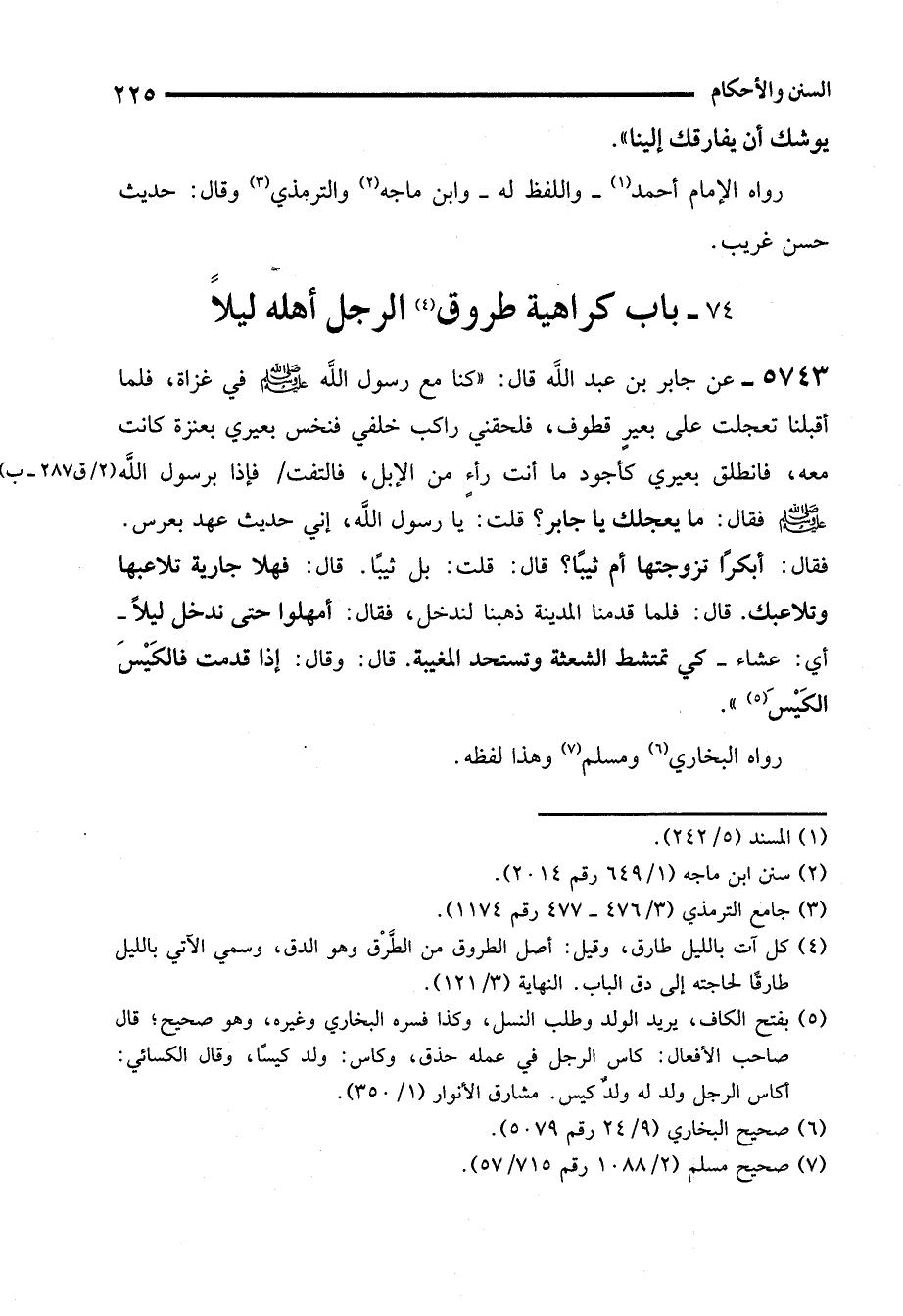 5743 - عن جابر بن عبد الله قال: "كنا مع رسول الله - صلى الله عليه وسلم - في غزاة، فلما أقبلنا تعجلت على بعيرٍ قطوف، فلحقني راكب خلفي فنخس بعيري بعنزة كانت معه، فانطلق بعيري كأجود ما أنت راءٍ من الإبل، فالتفت فإذا برسول الله - صلى الله عليه وسلم -، فقال: ما يعجلك با جابر؟ قلت: يا رسول الله، إني حديث عهد بعرس. فقال: أبكرًا تزوجتها أم ثيبًا؟ قال: قلت: بل ثيبًا. قال: فهلا جارية تلاعبها وتلاعبك. قال: فلما قدمنا المدينة ذهبنا لندخل، فقال: أمهلوا حتى ندخل ليلاً -أي: عشاء- كي تمتشط الشعثة وتستحد الغيبة. قال وقال: إذا قدمت فالكَيْسَ الكَيْسَ (¬5) ".