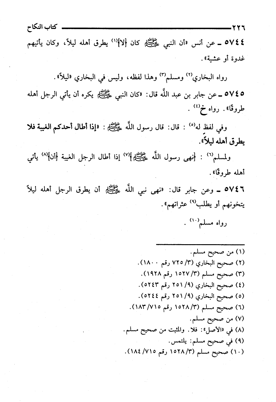 5744 - عن أنس "أن النبي - صلى الله عليه وسلم - كان (لا) (¬1) يطرق أهله ليلاً، وكان يأتيهم غدوة أو عشية".