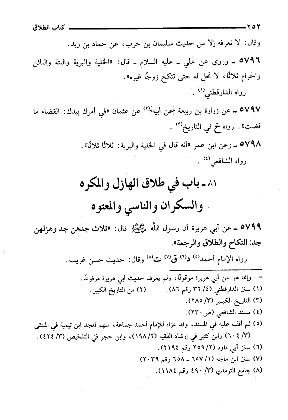 5799 - عن أبي هريرة أن رسول الله - صلى الله عليه وسلم - قال: "ثلاث جدهن جد وهزلهن جد: النكاح والطلاق والرجعة".