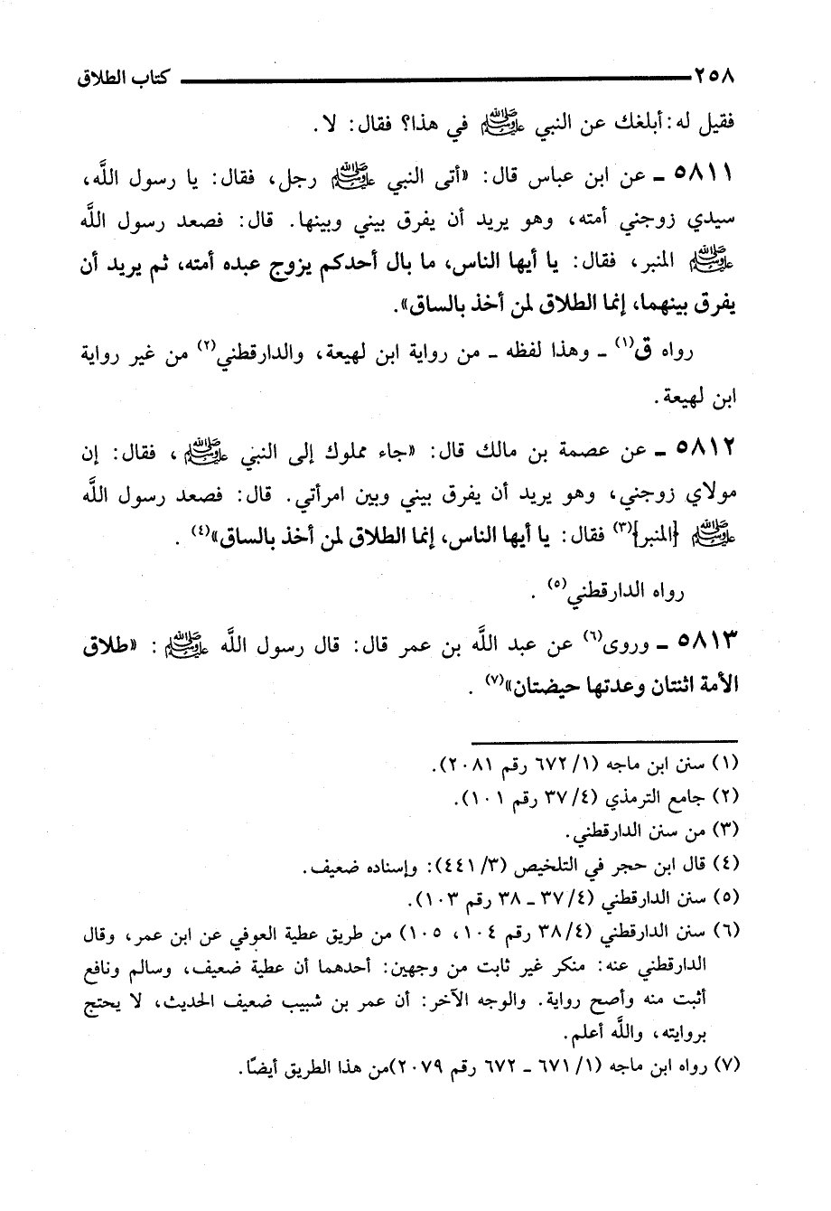 5811 - عن ابن عباس قال: "أتى النبي - صلى الله عليه وسلم - رجل، فقال: يا رسول الله، سيدي زوجني أمته، وهو يريد أن يفرق بيني وبينها. قال: فصعد رسول الله - صلى الله عليه وسلم - المنبر، فقال: يا أيها الناس، ما بال أحدكم يزوج عبده أمته، ثم يريد أن يفرق بينهما، إنما الطلاق لمن أخذ بالساق".