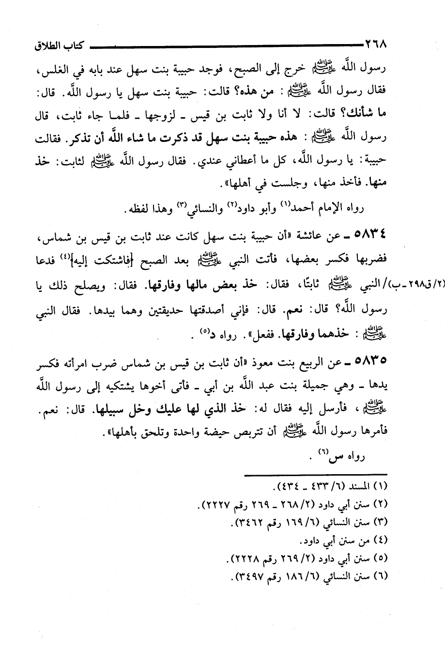 5835 - عن الربيع بنت معوذ "أن ثابت بن قيس بن شماس ضرب امرأته فكسر يدها -وهي جميلة بنت عبد الله بن أبي- فأتى أخوها يشتكيه إلى رسول الله - صلى الله عليه وسلم -، فأرسل إليه فقال له: خذ الذي لها عليك وخل سبيلها. قال: نعم. فأمرها رسول الله - صلى الله عليه وسلم - أن تتربص حيضة واحدة وتلحق بأهلها".