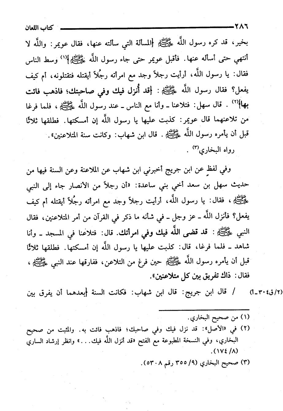وفي لفظٍ عن ابن جريج أخبرني ابن شهاب عن الملاعنة وعن السنة فيها من حديث سهل بن سعد أخي بني ساعدة: "أن رجلاً من الأنصار جاء إلى النبي - صلى الله عليه وسلم -، فقال: يا رسول الله، أرأيت رجلاً وجد مع امرأته رجُلاً أيقتله أم كيف يفعل؟ فأنزل الله -عز وجل- في شأنه ما ذكر في القرآن من أمر المتلاعنين، فقال النبي - صلى الله عليه وسلم -: قد قضى الله فيك وفي امرأتك. قال: فتلاعنا في المسجد -وأنا شاهد- فلما فرغا، قال: كذبت عليها يا رسول الله إن أمسكتها. فطلقها ثلاثاً قبل أن يأمره رسول الله - صلى الله عليه وسلم - حين فرغ من التلاعن، ففارقها عند النبي - صلى الله عليه وسلم -، فقال: ذاك تفريق بين كل متلاعنين".